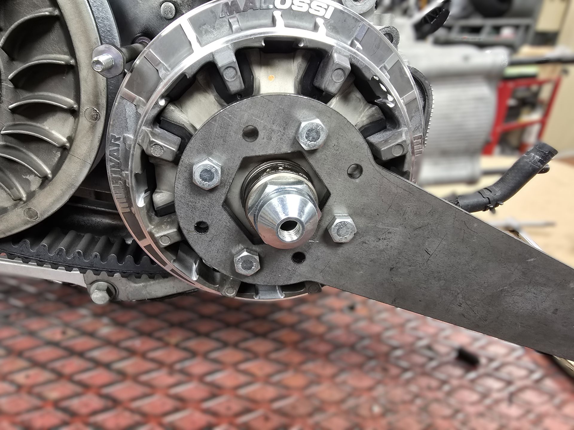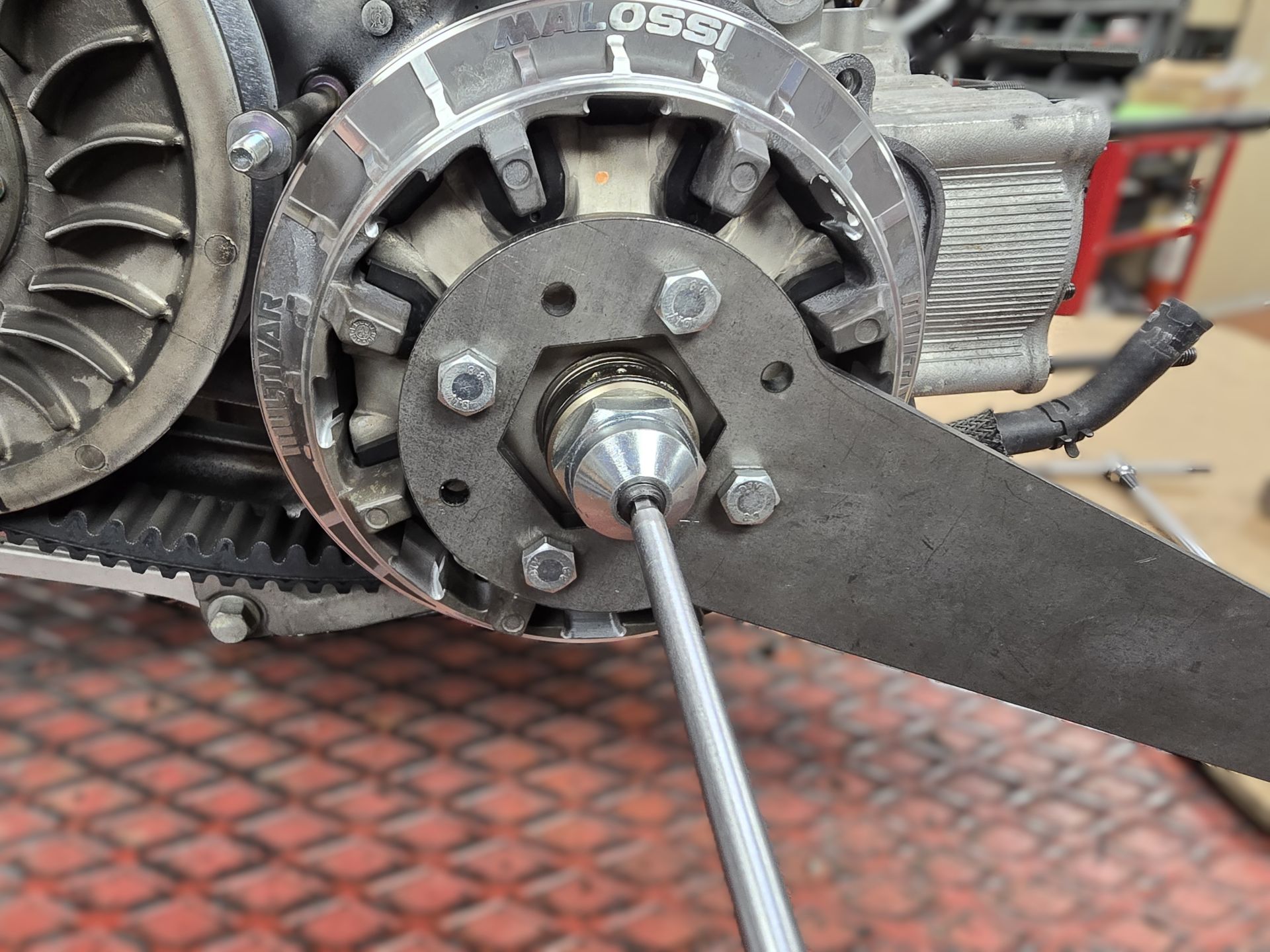 It provides additional safety for variator nut tightening, avoiding the use of thread-locker products, which can sometimes be too aggressive on the 100-teeth shaft.